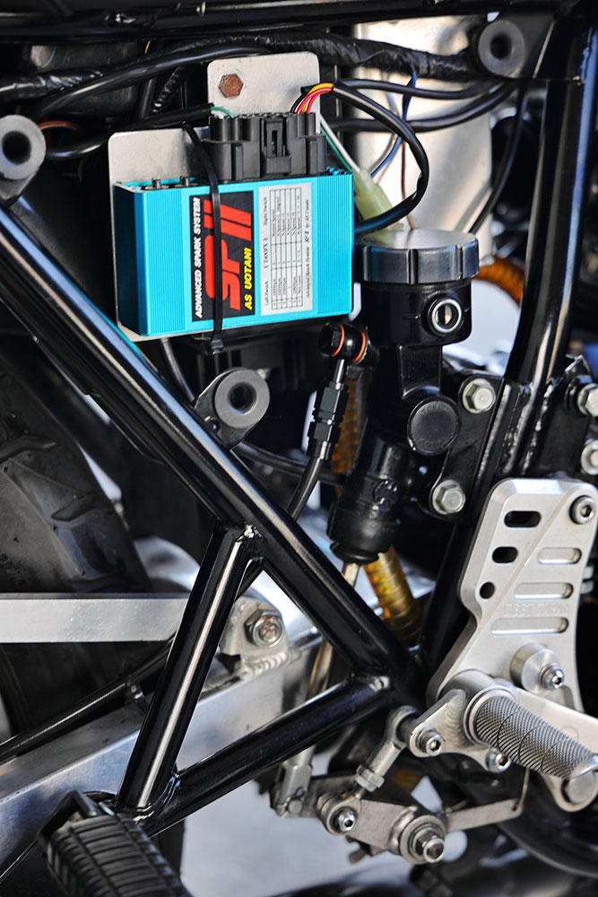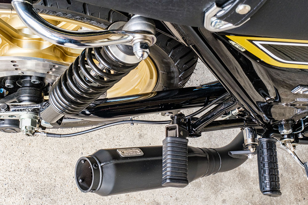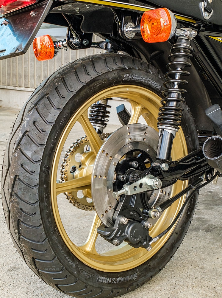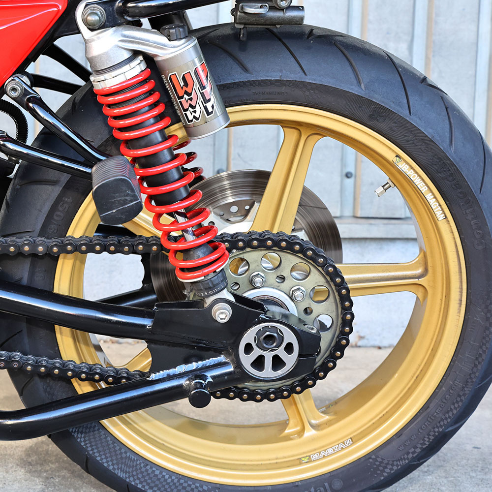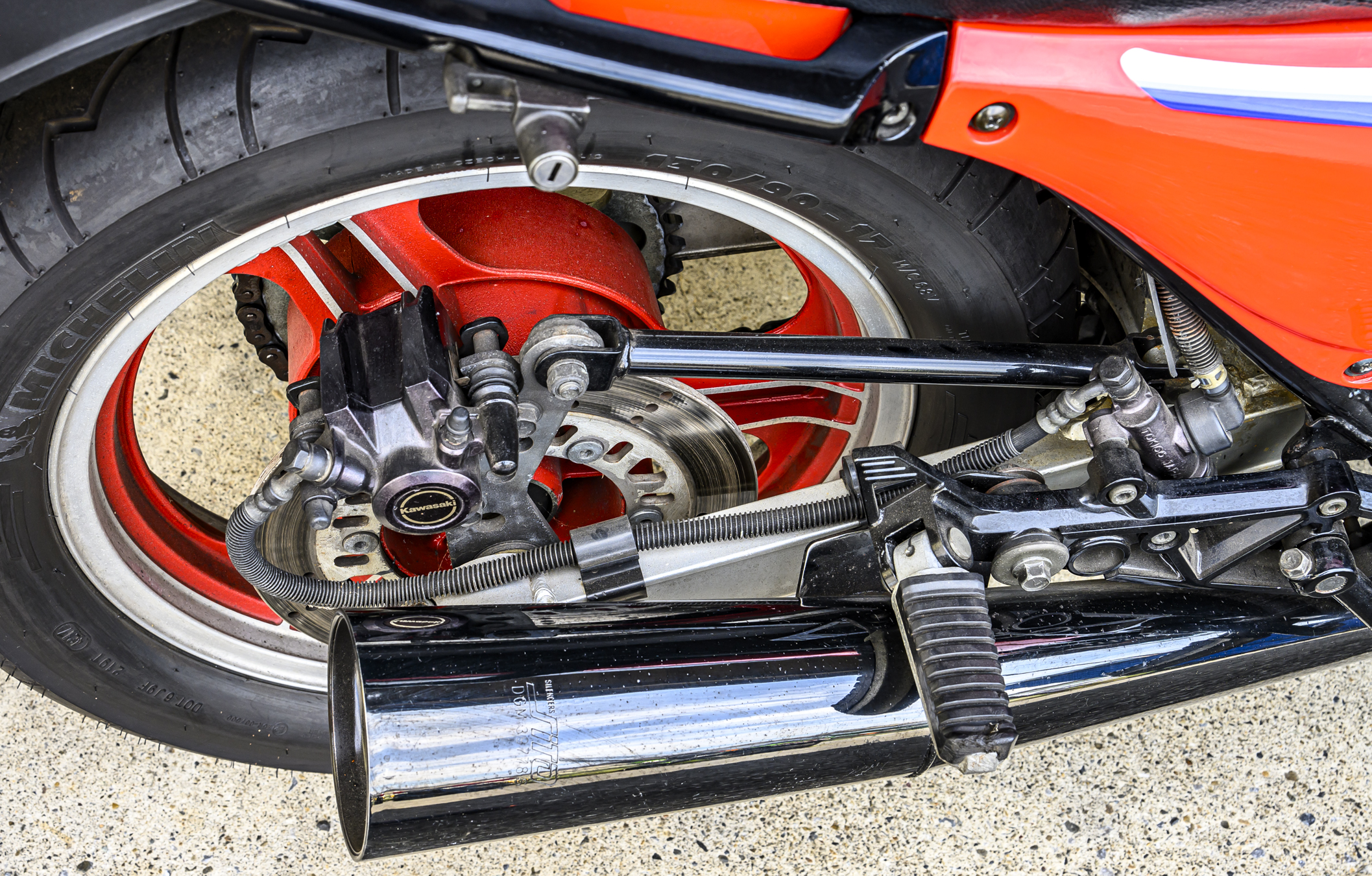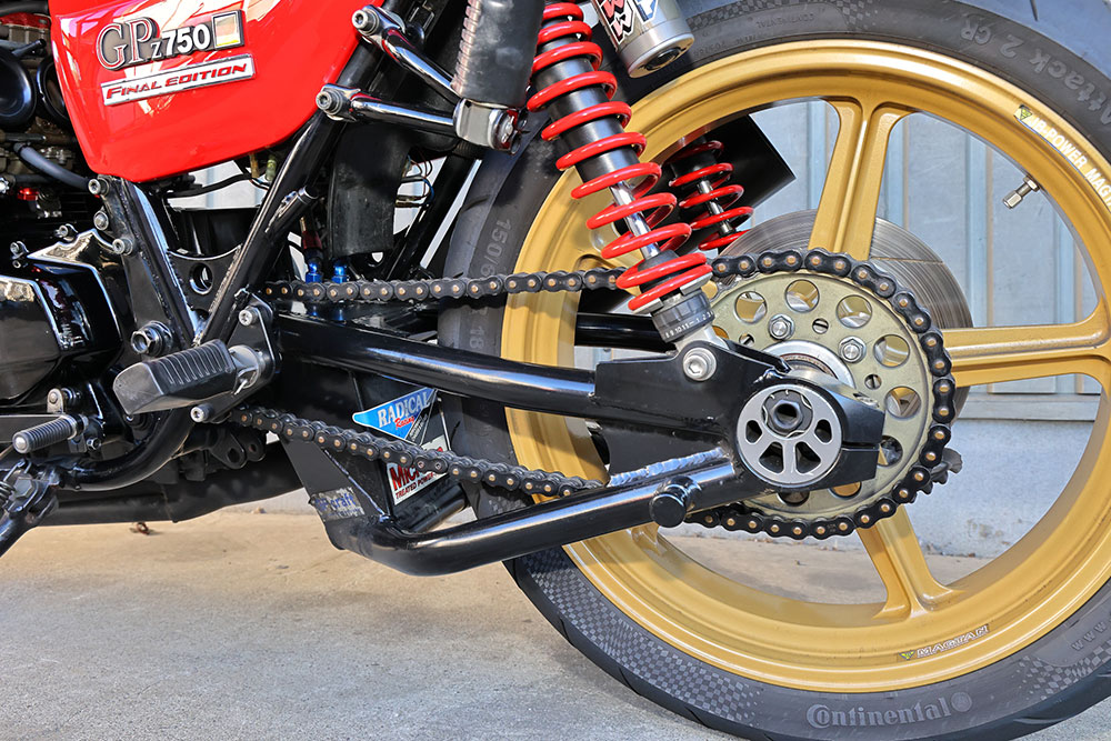 ゲイルスピードホイール、XJR400スイングアーム加工、Rサス : オーリンズ レジェントツイン、SSイトウ製 バックステップ、