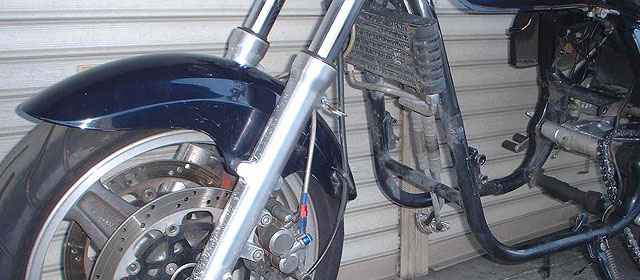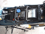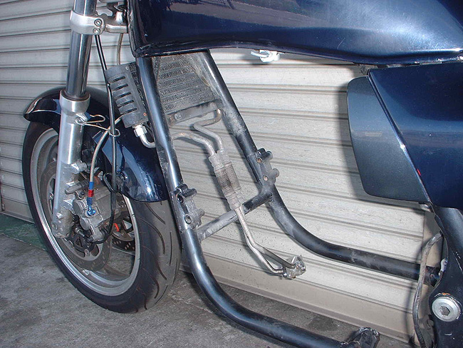 ETCアンテナは目立たないよう移動することにする。ブレーキマスターリザーバータンクが気になる。トップブリッジのヤレがひどい。
