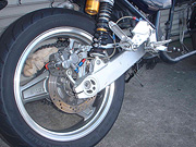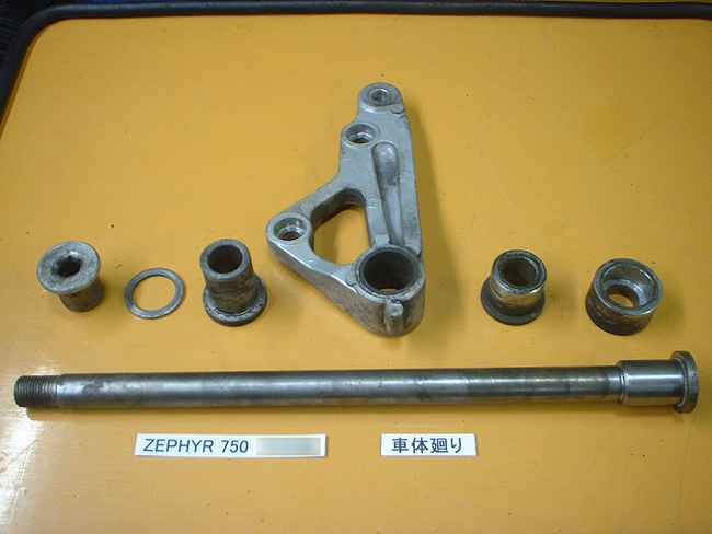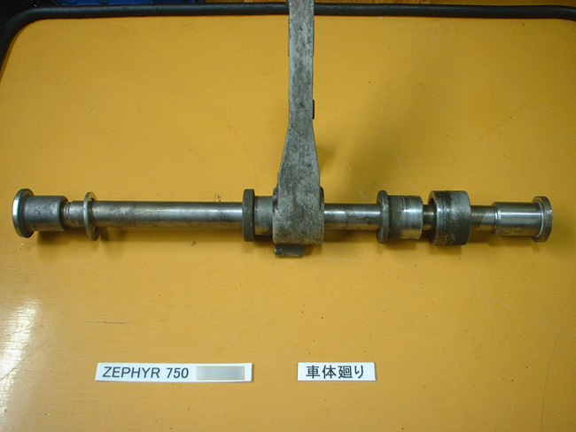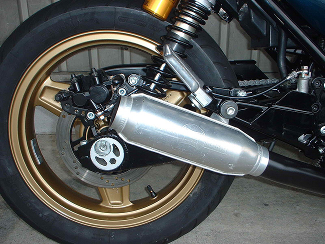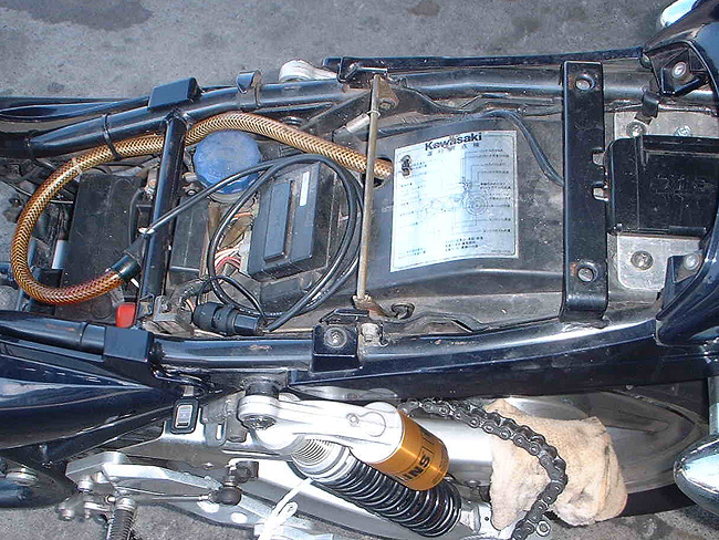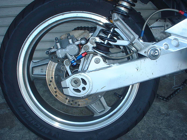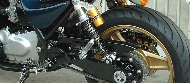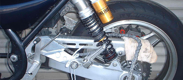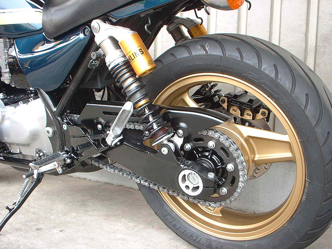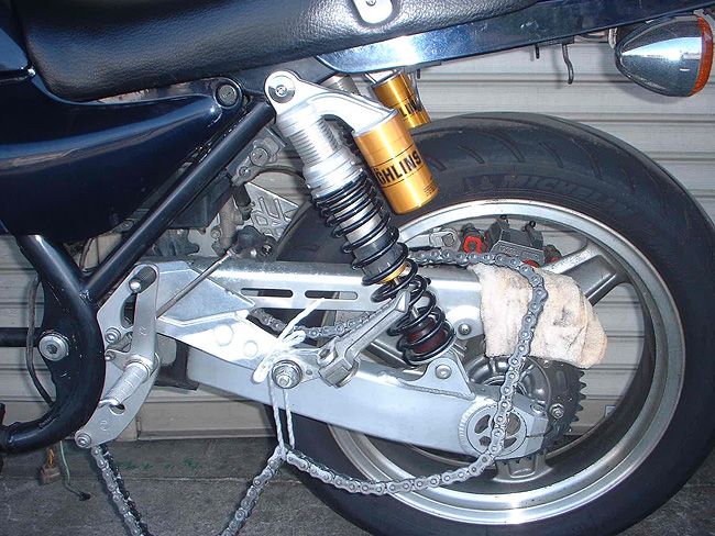 リヤサスペンションはすでに交換済みであった。ドライブチェーンは洗浄・注油し再使用する。