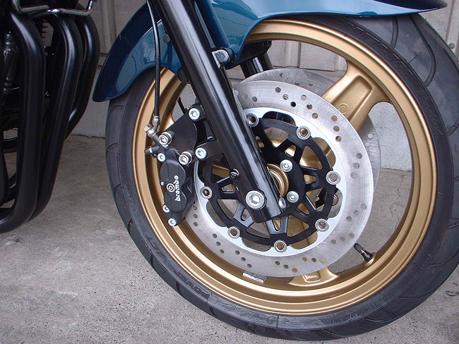 ブレンボ4Pキャストを装着する。ブレーキローターは新品。
